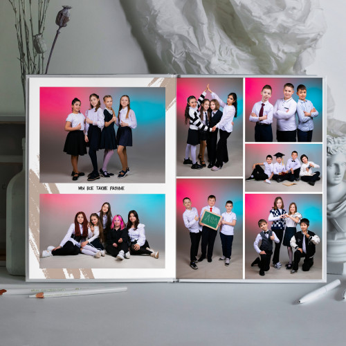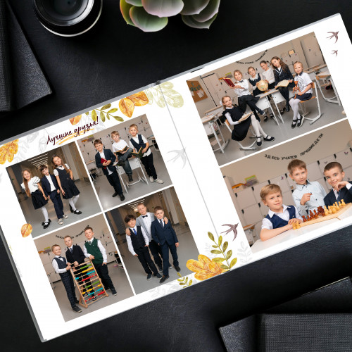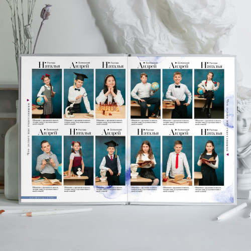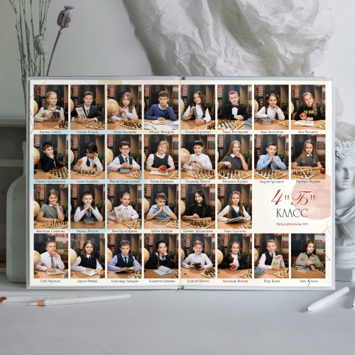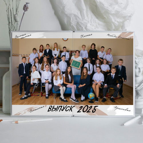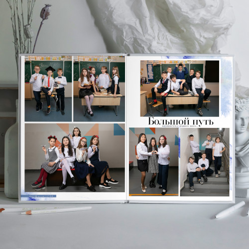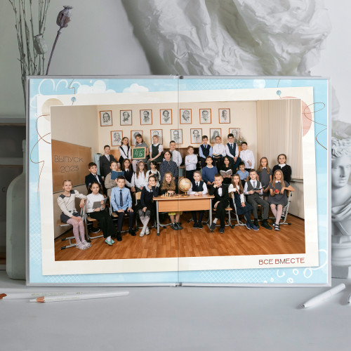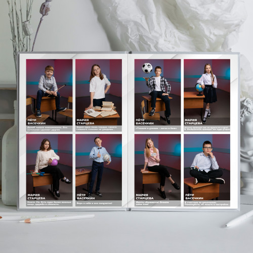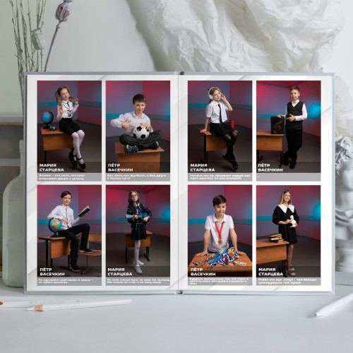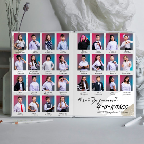 - Пакет 2: Портрет на обложке, второй индивидуальный портрет на развороте с учителем, виньетка всего класса, разворот групповых фотографий с одноклассниками, общегрупповое фото. (8 станиц) 3 300₽