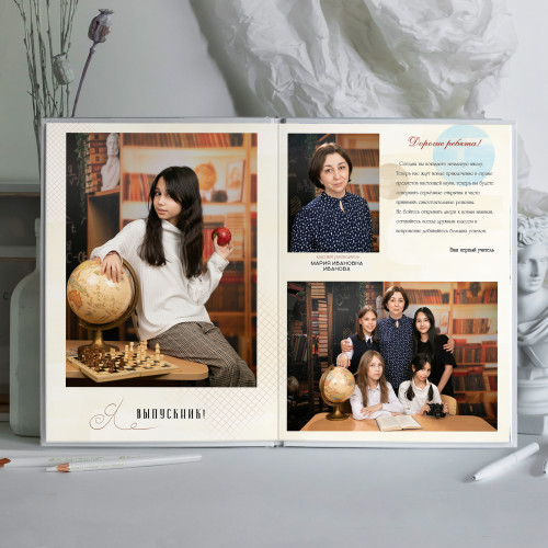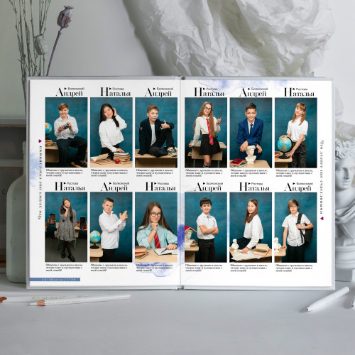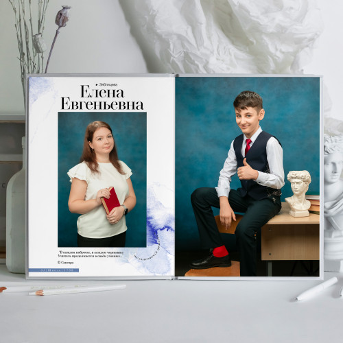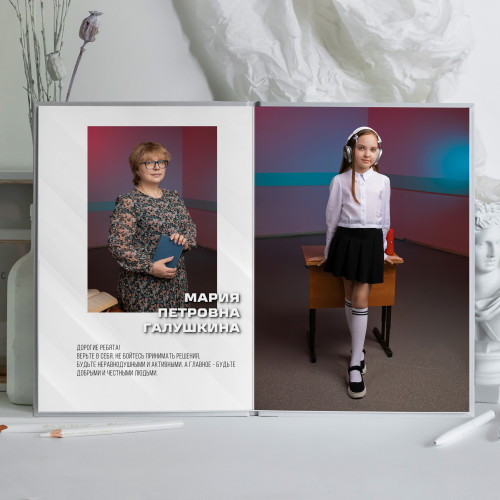 - Пакет 1: Портрет на обложке, второй индивидуальный портрет на развороте с учителем, виньетка всего класса. (4 страницы) 2 700₽